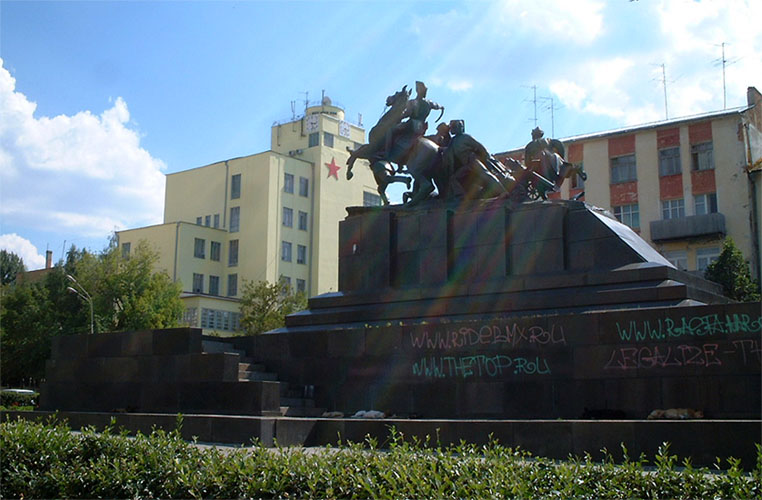 За памятником возвышается здание штаба Приволжско-Уральско военного округа.