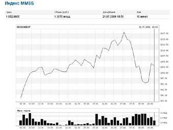 Российские фондовые индексы по итогам торгов 21 июля выросли. Основной показатель ММВБ смог удержаться выше психологически важной отметки в 1000 пунктов. К концу торговой сессии он поднялся на 1,73 процента до 1002,88 пункта. Накануне ММВБ поднимался выше тысячи пунктов, однако не смог зафиксироваться на этом уровне.