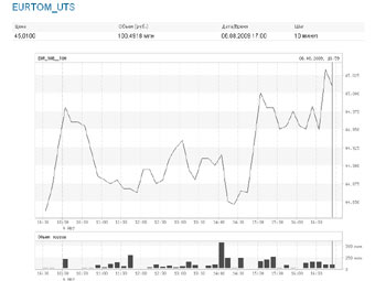 По итогам торгов на ММВБ 6 августа средневзвешенный курс евро с расчетами "завтра" поднялся более чем на 10 копеек до 44,92 рубля. Однако последние сделки на бирже заключались выше отметки в 45 рублей за евро. Официальный курс европейской валюты, устанавливаемый ЦБ, последний раз был выше 45 рублей 15 июля.