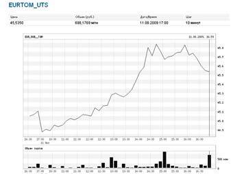 Средневзвешенный курс евро к рублю расчетами "завтра" вырос по итогам торгов на ММВБ на 48,76 копейки, достигнув 45,407 рубля. В то же время курс доллара поднялся на 33 копейки и закрылся выше чуть выше 32 рублей. Бивалютная корзина (0,55 доллара + 0,45 евро), рассчитанная по последней сделке выросла на 44,15 копейки, составив 38,2233 рубля.