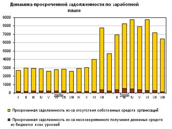 Задолженность по заработной плате за июль 2009 года составляет 39 процентов от общего объема просроченной задолженности. При этом на долги, образовавшиеся в 2008 году, приходится 905,9 миллиона рублей, а в 2007 году и ранее - 439 миллионов рублей. Долги предприятий по зарплате из-за отсутствия собственных средств, по данным на 1 августа, составили 6,3 миллиарда рублей, или 97,5 процента от общей суммы задолженности. По сравнению с 1 июля этот показатель снизился на 8,8 процента, или на 606 миллионов рублей.