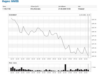 Российские фондовые индексы значительно снизились по итогам торгов 21 сентября. Индекс РТС упал на 2,81 процента до 1210,51 пункта, а основной показатель ММВБ - на 3,58 процента до до 1165,11 пункта.