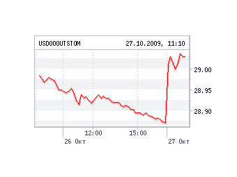 Средневзвешенный курс доллара на ММВБ в начале торгов 27 октября вырос на 10 копеек, вновь поднявшись выше отметки в 29 рублей. Одновременно курс евро снизился на 19,5 копеек до 43,2623 рубля. Бивалютная корзина, рассчитанная по последней сделке, подорожала на 3 копейки до 35,4295 рубля.
