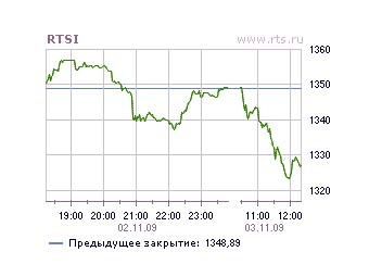 Российские фондовые индексы значительно снизились в начале торгов 3 ноября. Индекс РТС к 11:50 по московскому времени упал на 2,37 процента до 1324,86 пункта, а основной показатель ММВБ опустился на 2,91 процента до 1229,44 пункта.