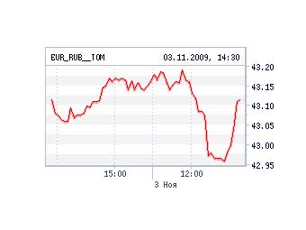 Курс евро расчетами "завтра" в ходе торгов на ММВБ упал ниже отметки в 43 рубля, достигнув минимального уровня в 42,945 рубля. Последний раз так мало европейская валюта стоила в середине января. В то же время средневзвешенный курс евро снизился по сравнению с показателем предыдущего дня на 5,32 копейки до 43,063 рубля.