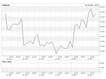 Бивалютная корзина в начале торгов 20 ноября упала до 35,28 рубля, на 10 копеек больше уровня закрытия предыдущего дня. В ходе торговой сессии 19 ноября стоимость корзины также резко выросла после того как вплотную приблизилась к 35-рублевой отметке.