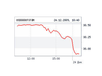 Курс рубля утром 24 декабря на ММВБ резко укрепился как по отношению к доллару, так и к евро. По данным на 10:45 по московскому времени, средневзвешенный курс доллара упал на 44,8 копейки до 29,96 рубля, а евро - на 31 копейку до 43,05 рубля. Бивалютная корзина, рассчитанная по последней сделке, оценивается в 35,76 рубля - это на 23,7 копейки меньше, чем на время закрытия торгов днем ранее.