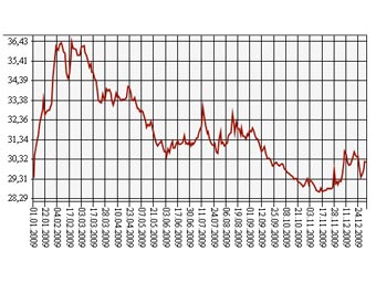 Курс рубля резко снижался в начале 2009 года из-за "плавной" девальвации, вызванной финансовым кризисом. Достигнув многолетних минимумов в феврале, рубль начал постепенно дорожать к основным валютам. После бурного роста осенью курс российской валюты в последний месяц года вновь немного снизился.