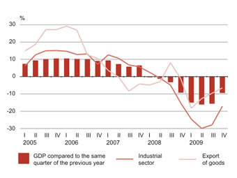 В целом за 2009 год ВВП Эстонии упал на 14 процентов. По сравнению с четвертым кварталом 2008 года экономика страны в последние три месяца 2009 года сократилась на 9,4 процента. В третьем квартале аналогичный показатель составил 15,9 процента, во втором - 15,8 процента, а в первом - 14,2 процента.