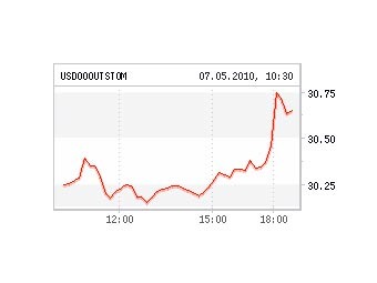 Средневзвешенный курс доллара в первые полчаса торгов 7 мая подскочил на 49 копеек, достигнув 30,76 рубля. Таким образом, американская валюта установила максимум к рублю за последние 2,5 месяца. В то же время курс евро поднялся на 32 копейки до 38,97 рубля. Бивалютная корзина, рассчитанная по последней сделке, подорожала на 17 копеек до 34,35 рубля.