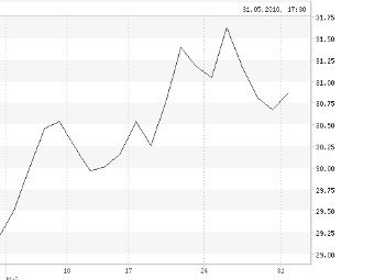 Курс доллара США вырос в мае на ММВБ на 1,68 рубля, достигнув отметки 30,86 рубля. В то же время евро подешевел на 85 копеек, опустившись к концу месяца до 38 рублей. Бивалютная корзина (0,55 доллара плюс 0,45 евро) прибавила в цене 50 копеек до 34,1 рубля.