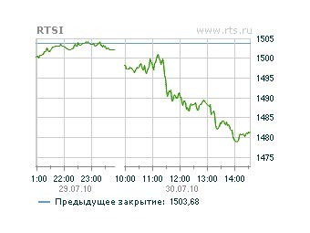 Российские фондовые индексы к середине торгов 30 июля снизились приблизительно на полтора процента: ММВБ опустился на 1,38 процента до 1398,72 пункта, а РТС - на 1,51 процента до 1480,9 пункта. Днем ранее РТС закрылся выше 1500 пунктов, а ММВБ - выше 1400 пунктов.
