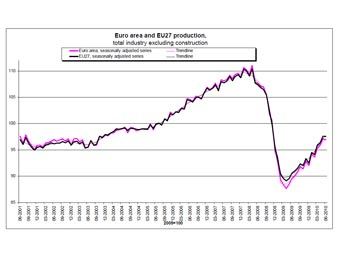 Объем промпроизводства в ЕС до сих пор находится существенно ниже докризисного максимума (на 12,7 процента). Пока что наступивший после рецессии рост в индустрии позволил отыграть лишь менее половины потерь.
