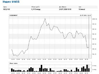 Российские фондовые индексы резко выросли по итогам торгов 20 июля. Индекс ММВБ прибавил 2,03 процента до 985,81 пункта, а основной показатель РТС подскочил на 5,11 процента до 972,31 пункта. В ходе сессии на ММВБ основной индекс превышал отметку в 1000 пунктов, но не сумел на ней удержаться.