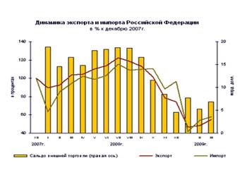 Торговый оборот России с зарубежными странами стал снижаться в конце 2008 года из-за падения цен на нефть и металлы, а также спроса на российскую продукцию за границей и иностранную - в России. Нефть, нефтепродукты и газ составляют около двух третей всего российского экспорта.