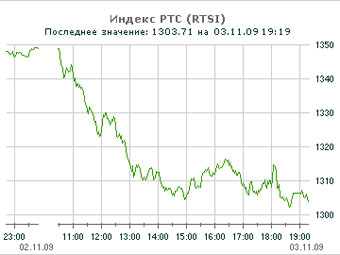 Российские фондовые индексы завершили торги 3 ноября в глубоком минусе. Индекс РТС упал по итогам сессии на 3,83 процента до 1305,11 пункта, а основной показатель ММВБ - на 3,78 процента 1218,42 пункта.