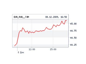Курс европейской валюты по последней сделке дня на ММВБ вырос до 45,1 рубля, поднявшись в ходе сессии сразу на 81 копейку. Курс доллара поднялся на 63 копейки до 30,55 рубля. Стоимость бивалютной корзины увеличилась более чем на 70 копеек и превысила 37 рублей.