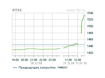 Российские фондовые индексы начали первую в 2010 году торговую сессию резким ростом. К 10:50 по московскому времени основной показатель РТС вырос на 6,2 процента до 1534,15 пункта, а ММВБ - на 4,39 процента до 1430,1 пункта.