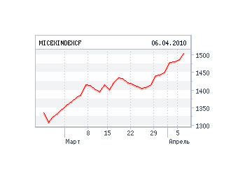 Основной показатель ММВБ в ходе торгов 6 апреля превысил 1500 пунктов, обновив максимум за последние 20 месяцев. К 15:55 по московскому времени индекс ММВБ вырос на 1,19 процента до 1505,19 пункта. Индекс РТС к тому же времени прибавил 0,92 процента и достиг 1641,72 пункта.