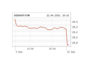 Курс доллара на ММВБ утром 12 апреля упал сразу почти на 30 копеек и впервые в 2010 году находится ниже отметки в 29 рублей. Стоимость евро, наоборот, выросла более чем на 30 копеек до 39,5 рубля.