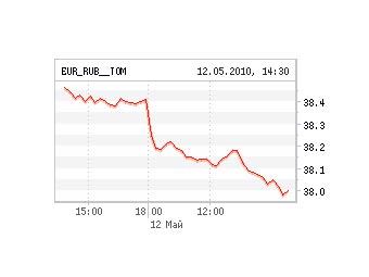 Курс евро на ММВБ в середине торгов 12 мая опустился ниже 38 рублей - к 14:30 по московскому времени сделки проходили по 37,98 рубля. В то же время средневзвешенный курс евро находится пока выше этой отметки - в районе 38,11 рубля. За неполный день средневзвешенный курс снизился почти на 33 копейки.