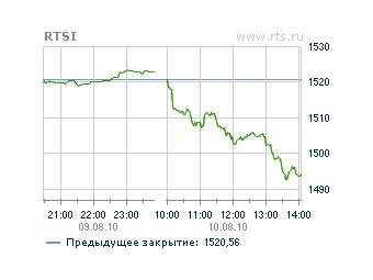 Индекс РТС в ходе торговой сессии 10 августа снизился на 1,66 процента до 1495 пунктов. Таким образом, основной показатель биржи упал ниже 1500 пунктов впервые с начала августа. Одновременно индекс ММВБ опустился на 1,71 процента до 1395 пунктов, также упав ниже психологически важной отметки - 1400 пунктов.