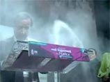 Как только женщина высыпала муку, телохранители Олланда схватили ее и вынесли за руки и ноги со сцены